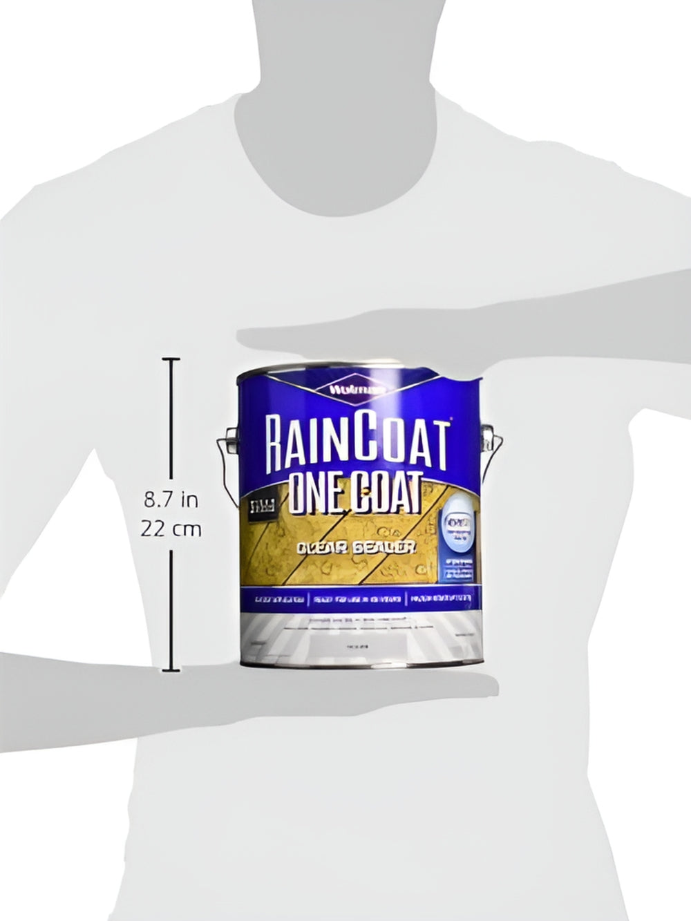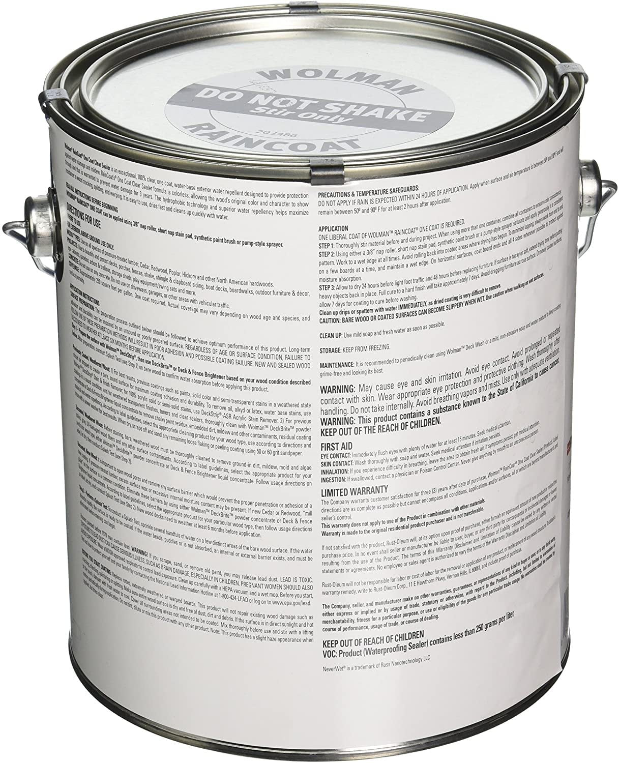 Wolman Raincoat, gallon, clear sealer, 1 coat transparent stain, clear water based exterior water repellant designed to provide protection against water damage, UV graying & mildew, beautifies wood with sheer natural wood toned color, which allows the woods character to show through while protecting the surface from water damage, never wet hydrophobic technology properties & superior water repellency helps maximize resistance to wood cracking, checking, splitting & warping, beautifies & protect decks, porches, fences, shake, shingle & clapboard siding, boat decks, boardwalks, outdoor furniture, gazebos, arbors & trellises, storage sheds & more, 250 sq. ft. per gallon, 1 coat.